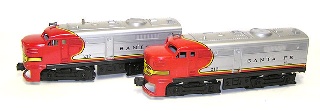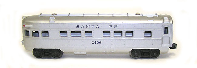 Lionel Set No. 11490 w/ 212 Santa Fe 2404 2405 2406Here is an extremely nice postwar Lionel Alco Diesel Set from 1964 - the No. 11490 Santa Fe Set. This set features the No. 212P and the No. 212T Alco AA units with horn. Includes the No. 2404 Vista Dome, the No. 2405 Pullman, and the No. 2406 Obsevation Passenger Cars. The powered A Unit measure 10-1/4" long not including the couplers. Condition of the set is excellent plus. No breaks or cracks. Runs very well in forward and reverse. The No. 2405 has a few minor scratches on its roof. The others all look very nice. A nice clean piece. Price: $341 SORRY! SOLD!