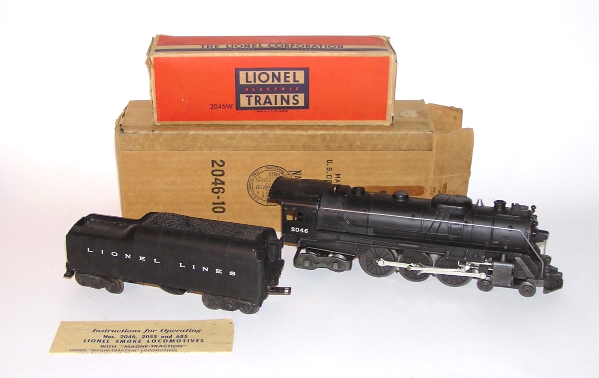 High Grade Lionel 2046 NYC 4-6-4 Locomotive w/ 2046W Tender OBHere is an extremely nice Lionel No. 2046 "O" gauge 2-6-4 steam locomotive from 1951 - with its original No. 2046W Lionel Lines Tender. Heat stamped lettering on the cab with die-cast metal trailing trucks. Loco appears to be in like new condition. I've included many photos for you to see all. No breaks or cracks. Runs in both forward and reverse, but would benefit from a cleaning as it probably hasn't been run since the 1950s. Tender is also really nice - no breaks or cracks. Whistle works one tender wire needs to be reattached. Engine box has a nice original insert, some tape marks on outside. Tender box show some wear on creases. Instruction sheet included. A really nice engine and tender. Please ask any questions. Thanks. Price: $350 Purchase Item! Click for confirmation page, with paying options.
