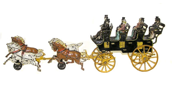 Here is a scarce toy – the Pratt & Letchworth 4-Seat Brake. Circa. 1890. A wonderful looking toy measuring a large 27″ long. All original cast iron figures on top of the carriage. Click here to view.