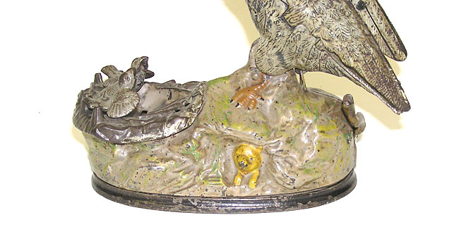 J & E Stevens Cast Iron Eagle & Eaglets Mechanical BankJ. & E. Stevens Co., designed by Charles Henn, patented 1883 - this is the Eagle and Eaglets cast iron mechanical bank. You place a coin in the eagles beak, press the lever in the back, and the coin is dropped into the nest as the eagle raises its wings and the little birds move up and down. A great action bank - and good looking too. This one is in very nice overall condition - as seen in the pictures. Shows some wear on the birds wings, but I see no breaks or cracks. Don't miss this for your collections. Price: $868 SORRY! SOLD!