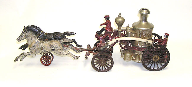 Large Hubley #10 Horse Drawn Fire Pumper Wagon 1900sHere is a great looking early Hubley No. 10 Fire Pumper with nickel plated boiler and correct cast iron figures. Measures a large 21-1/2" long. Horses are 6" long. Condition is very good - as seen in the pictures. Horses are missing some paint. No breaks or cracks. Some touch-up to red paint. A beautiful large early piece. Selling as is - so please ask questions before bidding. Don't miss this one! Price: $850 SORRY! SOLD!