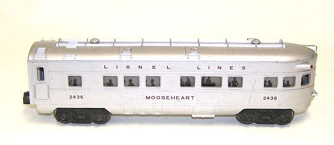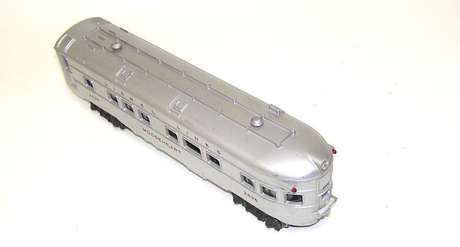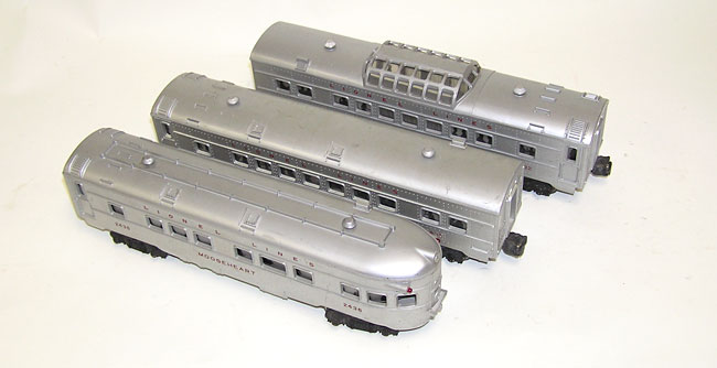 Lot (3) Lionel No. 2435 Elizabeth Pass. Car 2432 2436Here is a lot of (3) Lionel "O" gauge red letter Illuminated Passenger Cars - the No. 2432 "Clifton" Astra Dome, the No. 2435 "Elizabeth" Pullman, and the No. 2436 "Mooseheart" Observation Car. Plus their original BOXES. Overall these are in very good condition - as seen in the pictures. Overall they has some minor scratches, most noticably on the 2435. The trucks and couplers are clean. The boxes have some flaps missingand a tear to the 2436. Please ask any questions. Price: $199 SORRY! SOLD!
