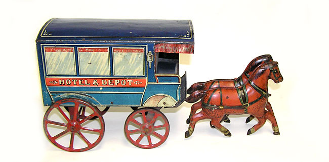 Early Converse Lithographed Tin Hotel & Depot Horse WagonConverse, lithographed tin, large scale open seat HOTEL & DEPOT wagon features colorful graphic image of ecarrage, drawn by two horses, spoke wheels. 18" long. Surface wear to litho. Metal hitch is broken from horses. One horse is missing two metal ears. Very good condition - as seen in the pictures. Don't miss. Price: $275 SORRY! SOLD!