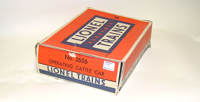 Lionel Postwar No. 3656 Stockyard Cattle Car Set w/BoxHere is a nice all original Lionel No. 3656 Cattle Car and Stockyard Set, with No. 3656 car and individual BOX, the No. 3656-34 cows with box, the stockyard plus its ramp, and set box. Made from 1949-55. Condition is excellent - as seen in the pictures. The cattle car is in great condition. Nice and bright with no chips or cracks. The 3656 Box is brick, all flaps present. Stockyard is in very good condition. The large box, which is the hardest part of this set, is missing its interior lining, has a small tear, and is missing a couple of interior flaps. 9 cows present. Offering all that is pictured. Don't miss this one for your postwar sets! Price: $119 SORRY! SOLD!