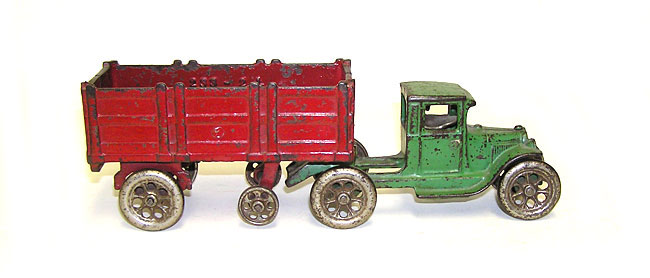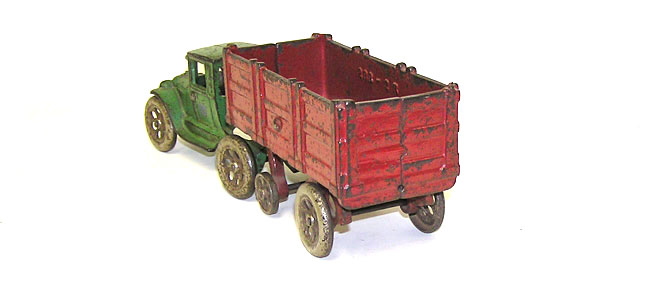 Rare Arcade No. 233 Cast Iron Stake Truck TrailerHere is a fantastic cast iron toy from Arcade, manufactured in 1931. This is called the "Stake Truck Trailer" - marked No. 233. The toy measures 11-5/16" x 2-3/4" with a height of 3-1/2". Rarely seen, this one is in great original condition. Nickel plated cast iron wheels that have never been off the truck, as the original axle peening is still intact. No breaks, cracks or repairs. One for the collection. Offering this wonderful piece with NO RESERVE. So please bid early and appropriately for the piece. I will be listing some other rare pieces this week so stay tuned. Buyer pays shipping. Please check out my other items currently listed, and save on shipping. NO RESERVE. Price: $850 SORRY! SOLD!