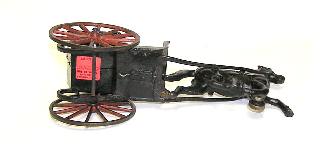 Wilkens Horse Drawn Cast Iron Doctor's Cart NO RESERVEHere is nice Wilkens horse drawn Doctor's Cart. A hard one to find! This horse drawn toy in in very good condition - as seen in the pictures. Last week I had a four wheel version, this is the two wheel cart. Measures 10" long. Original Doctor driver. No breaks or cracks. Black with copper colored highlights. Don't miss! Selling some other great horse drawn pieces - don't miss these! Buyer pays shipping. Please check out my other items currently listed, and save on shipping. NO RESERVE. Price: $349 SORRY! SOLD!