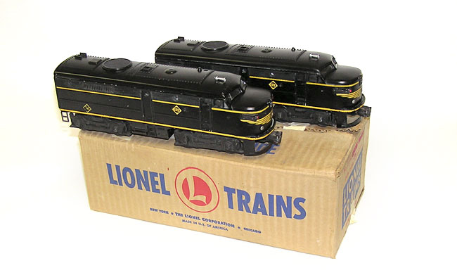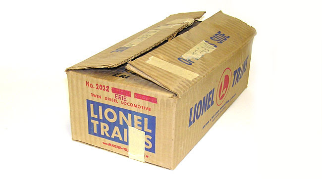 Lionel Postwar No. 2032 ERIE Alco AA Units + BOXHere is a great looking set of postwar "Erie" Diesel Locomotives from Lionel made from 1952-54. This is the AA set No. 2032. The powered unit has magnetraction, operating horn, operating coupler and an operating headight. The non-powered unit has an operating coupler and an operating headlight. Size of each is 10-1/2" not including the couplers. Condition is excellent, as seen in the pictures. Decals original, and in very good shape. Just a small piece missing on the front and one side. Battery compartment is free of corrosion. No cracks or breaks to the apron. Runs well. Just a couple of minute marks evident. Box might be a 2033 bax that someone crossed out to accomodate the 2032 Erie's. Don't miss this opportunity to own these unique Lionel trains. Price: $259 SORRY! SOLD!