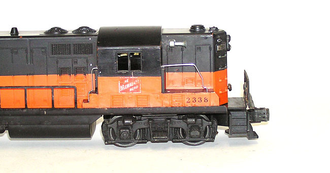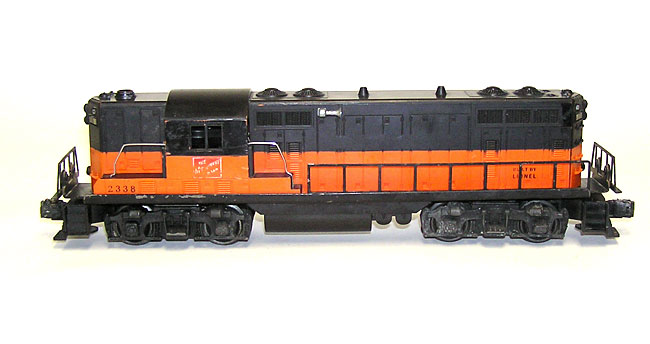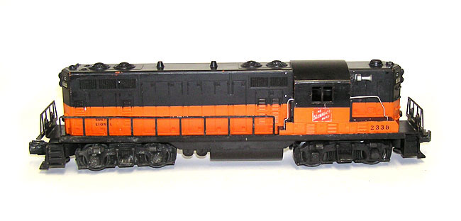 Hard Lionel 2338 Milwaukee Road GP-7 Diesel Orange StripeHere is the hard to find Lionel No. 2338 Milwaukee Road Diesel Engine, rare color variation, with the orange extending through the cab. Measures 13-1/2" long. Orange mold. The black on the roof has been repainted. There is wear to the Milwaukee Road name plates on the side of the cab. Frame is nice and clean. I took lots of pictures so that you could see all, and please ask any questions. A rare one for your collections. Price: $549 SORRY! SOLD!