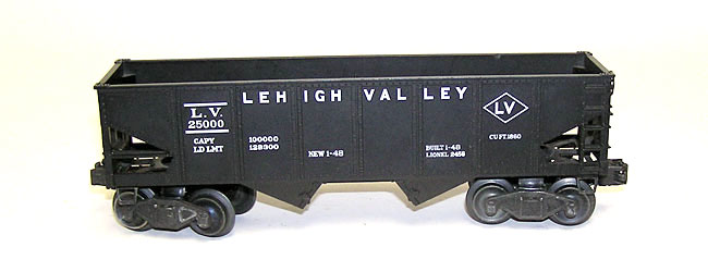 Lionel Postwar No. 2456 Lehigh Valley Hopper +BoxHere is an extremely nice No. 2456 Lehigh Valley Hopper with its original BOX. Made in 1948 only. Size is 8-1/8" long not including the couplers. This car is in excellent plus to like new condition as seen in the pictures. Box is brick with interior lining. I can't find much wrong with this one. Don't miss this nice freight. Price: $75 SORRY! SOLD!