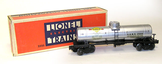 Lionel No. 2555 Sunoco Single-Dome Tank Car + BOXHere is an extremely nice original Lionel No. 2555 Sunoco Single-Dome Metal Tank Car plus original BOX. EARLY 1946 Model. Condition is pristine - as seen in the pictures. Cataloged from 1945 to 1948. With "Gas and Oils" in Sunoco decal. This is exceceptionally clean, close to 98%. Box is brick. Don't miss this one for your sets! I took clear pictures for you to see all - and please ask any questions. Price: $149 SORRY! SOLD!