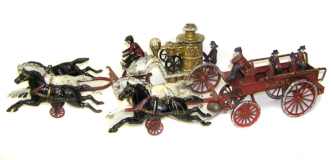 Rare Dent Cast Iron Horse Drawn Patrol Wagon w/ FiguresHere is a very nice large 2-horse Dent Patrol Wagon. What a great looking piece. This measures 20" long. Horses are each 9" long. Excellent condition as seen in the pictures. Has all the correct cast iron figures which I believe are replacements (?) Wagon painted the nice Dent red with gold highlights. No breaks or cracks. Don't miss this opportunity to own one of these nice Fire toys from the late 1800s, early 1900s. Price: $826 SORRY! SOLD!
