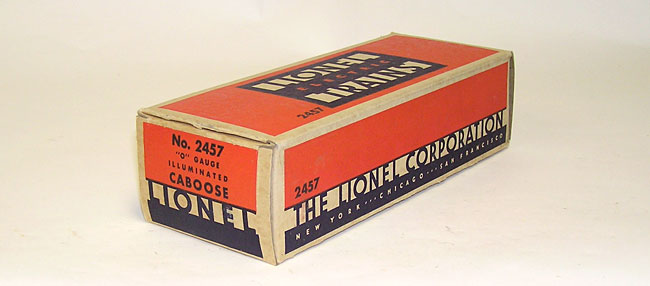 Lionel No. 2457 Pennsylvania Illuminated Caboose +BOXHere is an all original Lionel No. 2457 Pennsylvania Illuminated Metal Caboose plus its BOX. Flying shoe coupler. Condition is like new as seen in the pictures. This is the BOX with the interior flaps. It great condition. Cataloged from 1945 to 1947. This is marked "Eastern Division". Don't miss this one for your sets! Price: $79 SORRY! SOLD!
