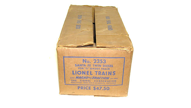 High Grade Lionel 2353 Santa Fe F3 Diesels AA Units MasterHere is a high grade pair of Lionel No. 2353 F-3 Santa Fe AA units in their Individual Boxes and Master Carton. Size of the engine is 13" not including its couplers. The power A unit contains dual motors with Magnetraction and a three-position E-unit. The non-powered A unit contains a functional horn, which has not been tested. Condition is as seen in the pictures, which is excellent plus. The red is nice and bright, the silver has a nice sheen. The units do have a couple of marks so they are not perfect, but all in all you won't be disappointed in this pair. A couple things to mention, the front decals show some wear. The powered unit is 98%, the non-powered unit is around 93%. Also, the non-powered unit has some fade marks on the top silver. Although minor, I tried to show you in the pictures. The units have their original boxes with inserts and paper on the powered unit box. The T box is very nice for that box, although it has some flaps that have been reinforced with tape.The Master carton is as pictured. In very nice overall condition. Comes with the units Instruction Sheet. A nice set for your collections. Don't miss! Price: $700 SORRY! SOLD!