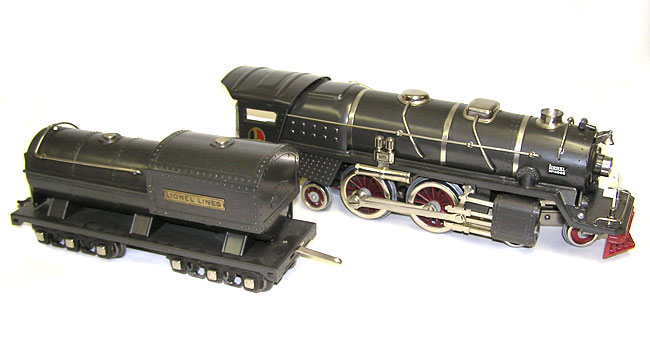 Lionel Gun Metal Gray Standard Gauge No. 400E Loco & TenderHere is one of Lionel's biggest and best engines in a great color - gun-metal gray. This is the No. 400E 4-4-4 Standard Gauge Steam Engine with its matching Tender, all with nickel and brass trim. This is a large and impressive piece. Made between 1927-36. This engine looks great and is in excellent condition. It has been beautifully restored. Pictures tell the story, and please ask any questions. Don't miss. Thanks. Price: $1300 SORRY! SOLD!