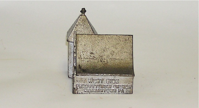Westside Presbyterian Church Cast Iron Still Bank NO REHere is one you won't see very often - this is a MAINE Battleship cast iron still bank, made by J. & E. Stevens, circa 1902. This bank offers a well detailed and scaled effect, painted in white w/green embossed wavy base. Great detailed paint highlights as seen in the pictures. Measures 10-1/4" long. What is nice about this piece is that it is all original, including the masts. Many times parts are replaced. It does show some wear as pictured. A wonderful and rare ship. Don't miss. Buyer pays shipping. Price: $616 SORRY! SOLD!