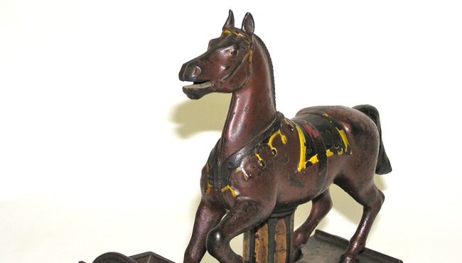 Trick Pony Cast Iron Mechanical Bank Circa 1885Here is a nice Trick Pony mechanical bank, manufactured by Shepard Hardware Company, Buffalo NY circa. 1885. You place a coin in the pony's mouth and pull the lever. The pony leans forward to deposit the coin into the trough. Condition is very good as seen in the pictures. No break or cracks. I believe that the trap is replaced. No key. Don't miss. Price: $679 SORRY! SOLD!