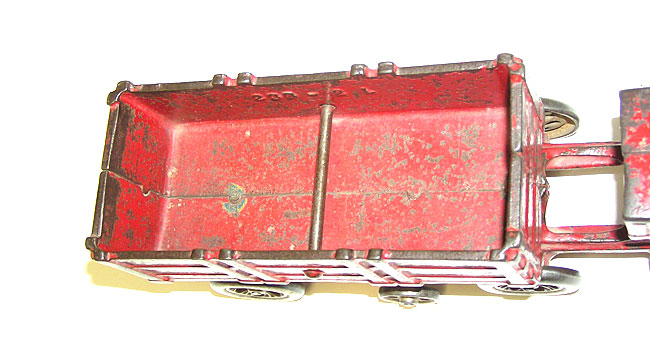 Rare Arcade No. 233 Cast Iron Stake Truck TrailerHere is a fantastic cast iron toy from Arcade, manufactured in 1931. This is called the "Stake Truck Trailer" - marked No. 233. The toy measures 11-5/16" x 2-3/4" with a height of 3-1/2". Rarely seen, this one is in great original condition. Has the harder red tractor. The nickel plated cast iron wheels have never been off the truck, as the original axle peening is still intact. No breaks, cracks or repairs. Arcade decals in the bed of the trailer, and on the side of the front end. Original nickeled cast iron driver. One for the collection. Price: $1199 SORRY! SOLD!