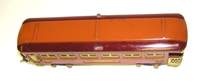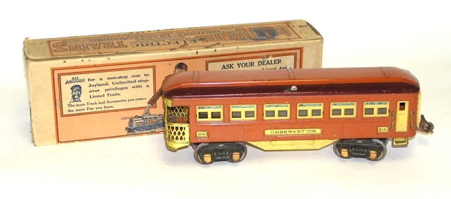Lionel Set of (3) Terra-Cotta 613 613 614 Pass. Cars +BoxesHere is a great set of Lionel prewar "O" gauge Passenger Cars from the 1930s. This set features the following terra-cotta and maroon two-toned illuminated passenger cars - the No. 613 Pullman Car - another No. 613 Pullman Car - and the No. 614 Observation Car. These come with their original Boxes - which are hard to find. I've included many pictures for you to see the overall condition, which I believe to be excellent. The cars are nice original examples. A few minor scratches. All handrails intact. Mostly clean trucks and couplers. Boxes has some flap issues. Some repaired, some with tape, some missing. Please see all the pictures. A great find! Please ask any questions - and if you need any additional photos let me know. Buy with confidence. Price: $393 SORRY! SOLD!