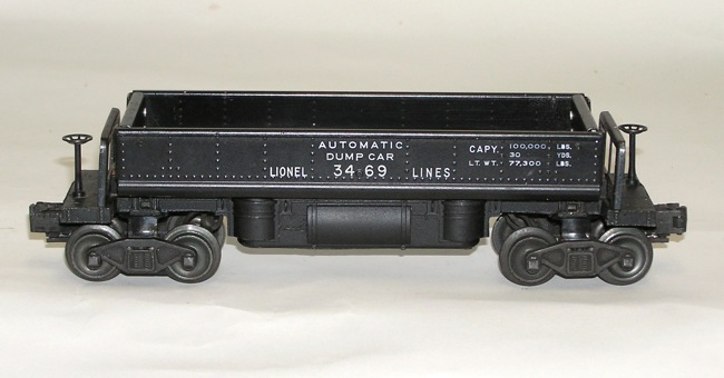 Lionel # 3469 High Grade Operating Dump Car +BOXHere is an extremely nice postwar Lionel "O" gauge No. 3469x metal Automatic Dump Car with its original BOX and #207 bag of coal. Size of the car is 8-1/2" not including its couplers. Condition is excellent plus with just a few marks in the dump bed keeping this from being Like New. Very little runtime. Pictures tell the story. Works fine. Box is missing one coupler flap. One end has a repair to the tuck flap. A beautiful looking car. Price: $129 SORRY! SOLD!