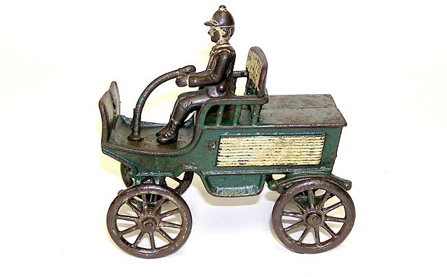 Very Early Ives Cast Iron Automobile w/ DriverHere is a fantastic very early cast iron automobile that is either Ives, Harris or Kenton - as I'm not sure which. This car was made in the late 1800s to early 1900s. Has a wonderful separate cast iron driver. It measures 6" long and approx. 6" high. Condition is very good for such an early piece. No breaks or cracks. Don't miss for your collection! Also, listing separately a smaller version of this car. Please see the bottom picture - this is for one item only. Price: $699 SORRY! SOLD!