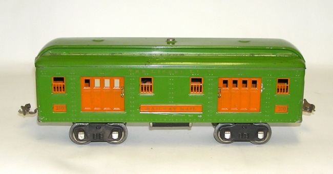 Set of (3) Lionel Std. Gauge Passenger Cars 309 310 312Tonight I'm listing a nice grouping of Lionel Standard Gauge trains (see bottom picture for the group - this auction is for one item only). Here is a nice set of Lionel Passenger Cars. A No. 309 Pullman, a No. 310 Railway Mail Car, and the No. 312 Observation. In green with orange trim. Keeping these cars together as they make a nice matched set. Overall, these are in very good condition - as pictured. Some minor scratching, and a little oxidation. Should clean up real well. Don't miss this set. Buyer pays shipping (Insurance is included in the shipping and handling fees for items over $300). Please check out my other items currently listed, and save on shipping. NO RESERVE. Price: $280 SORRY! SOLD!