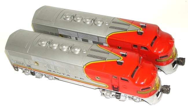 Lionel Postwar 2353 Santa Fe F3 Diesels AA Units +BOXESHere is a very nice pair of Lionel No. 2353 F-3 Santa Fe AA units and their original BOXES. The engines were made by Lionel made from 1953-1955. Size of the engines are 13" not including its couplers. The power A unit contains dual motors with Magnetraction and a three-position E-unit. The non-powered A unit contains a functional horn. Condition is excellent - as seen in the pictures. A couple minor marks in the red around the bottom fronts keep these from grading higher. The powered unit has a speck of green paint on the back of the top - should be able to come off. Someone scrolled in their name on the bottom. Silver looks real nice. Red bright and shinny. Engine hummed, and lights up but will need cleaning and a lube to run. The units have all their porthole windows. Clean battery compartment. The Powered Unit Box is in excellent condition with its interior lining. One end still sealed. The non-powered Box is missing flaps, and the lining is frayed. A hope you can see the condition from the photographs, and please ask any questions. A neat set! Also offering a "B" Unit and some Passenger Cars that would go with these engines in separate auctions (see bottom picture for the group - this auction is for the above listed only). Buyer pays shipping (Insurance is included in the shipping and handling fees for $500). Please check out my other items currently listed, and save on shipping. NO RESERVE. Price: $376 SORRY! SOLD!