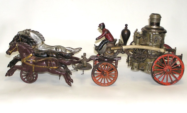 Rare Ideal 3-Horse Drawn Cast Iron Fire Pumper ToyHere is an outstanding original antique cast iron Ideal Horse Drawn Fire Toy - a 3-horse Fire Pumper. Measures 21-1/2" long. A great looking piece. A silver, black and brown horse. No breaks or cracks. The figure is original. Original paint. Nickel does show some wear. Man missing in rear. Has just one replacement hose. This is an impressive looking piece - don't miss. Price: $1825 SORRY! SOLD!