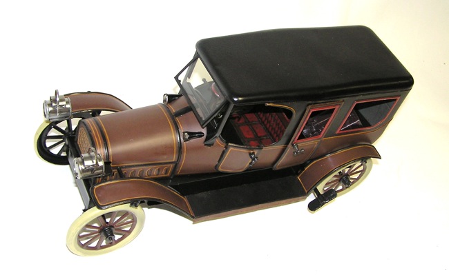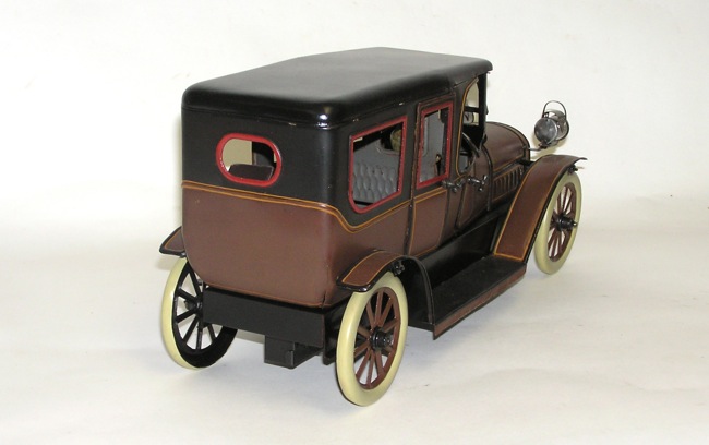 Wonderful German Made Karl Bub Saloon Limousine Large SizeHere is a great looking early German toy, c. 1915. A Karl Bub large luxury Limousine done in brown body, black roof and orange/brown pin striping. Measures 13-3/4" long. This is a beautifully done restoration. Hand crafted. The driver is original and is not repainted. Glass front window, replaced front headlights. Wind-up mechanism works great. A truly remarkable piece. I believe the pictures tell the story. Don't miss. Price: $1043 SORRY! SOLD!