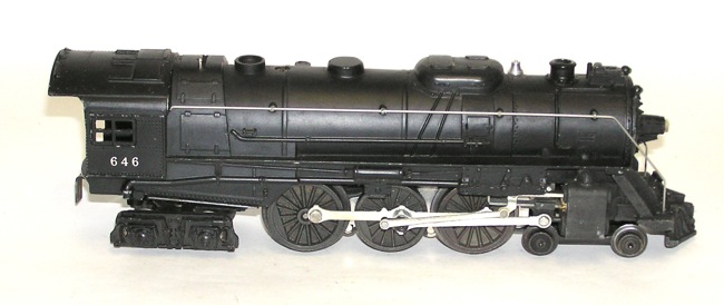 High Grade Lionel 646 Hudson 4-6-4 Loco w/ 2046W TenderHere is an extremely nice Lionel No. 646 4-6-4 postwar "O" gauge Hudson steam locomotive with its matching No. 2046W Tender - 1956. The 646 is a hybrid, as Lionel utilized the same boiler casting of the 736 Bershire with a 4-6-4 wheel arrangement. The engine measures 11-1/2" long not including it couplers. These are in excellent plus to like new condition - as seen in the pictures. Ran in forward and reverse, could use a lube to run perfectly. Original paint. The tender is beautiful. Like new. No breaks or cracks. The tender box is missing its flaps on one end. A real nice set. Offering in AUCTION format (support the auction format!) with NO RESERVE. Buyer pays shipping (Insurance is included in the shipping and handling fees for items over $300). Please check out my other items currently listed, and save on shipping. NO RESERVE. Price: $256 SORRY! SOLD!