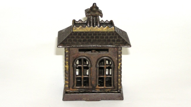 Grey Iron Cast Iron State Bank - Circ. 1900s SmallThis is an extremely nice Grey Iron "State Bank". This is the small 4-1/4" size. Made in the early 1900s. This bank is in very goog condition - as seen in the pictures. No breaks or cracks. Japanned finish with gold highlights. Original turnpin. One for the collection. Price: $79 SORRY! SOLD!