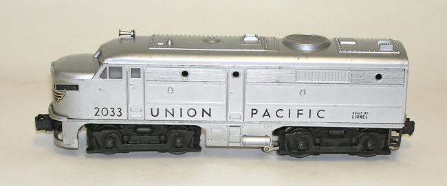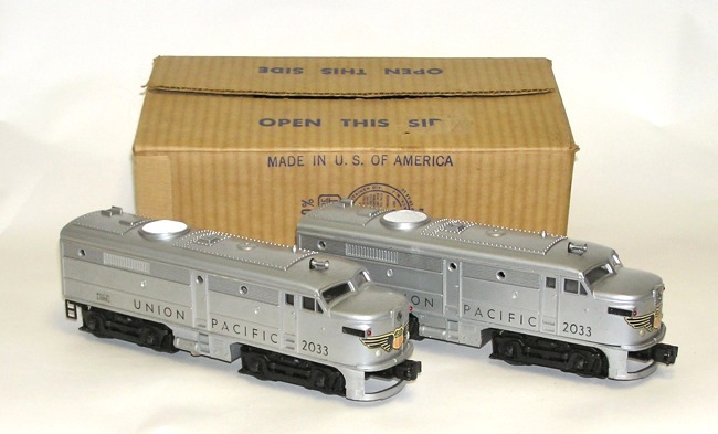 Lionel No. 2033 Postwar Union Pacific AA Diesels +BOXHere is an extremely nice pair of Lionel postwar 'O" gauge trains - the powered and non-powered (AA) Union Pacific Diesel Locomotives. Comes with its original Master Carton. These are numbered No. 2033, and are the all silver versions. Each measures 10-1/4" long not including the couplers. The shells look very nice overall. Still has most of that new bright silver patina. Some little marks here and there. The powered unit runs in both forward and reverse. Powered unit has a small spot of battery corrosion as you can see in the pictures. Decals on the front of both units are original and mostly complete. Horn has not been tested. Box is missing its inserts. A great set - don't miss. Price: $635 SORRY! SOLD!