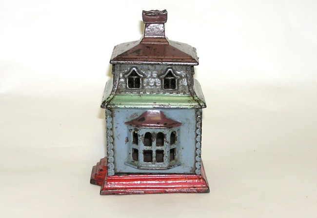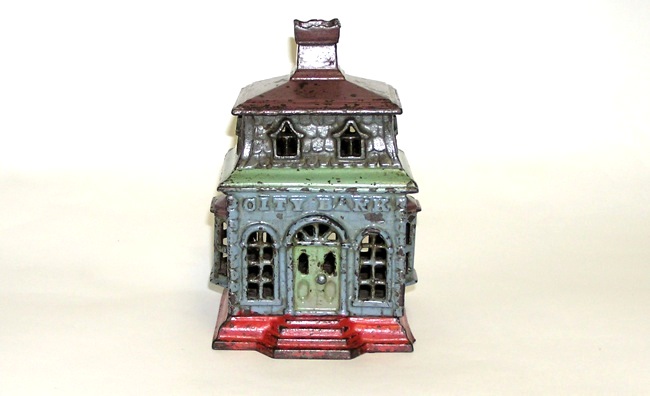 Scarce Painted Cast Iron "City Bank w/ Chimney" 1873Here is a wonderful cast iron bank you will not see very often, especially in this kind of condition. This is called the City Bank with Chimney. Thomas Swan designed, US patent 1873. The bank measures 6-3/4" x 4-3/4" x 4-3/4". In excellent condition as you can see in the pictures. No breaks or cracks. All original. Estimated at $2500- $3,000, however, our reserve is lower. Don't miss this one for your collections. This evening we are offering a large grouping of cast iron toys (see bottom picture for the group). Please check my listings to see them all - and don't miss the date Feb. 13th when these all are going off. Please email with any questions. Thanks. Offering in AUCTION format (support the auction format!). Buyer pays shipping (Insurance is included in the shipping and handling fees for an estimate of $2,000). Please check out my other items currently listed, and save on shipping. Price: $2313 SORRY! SOLD!