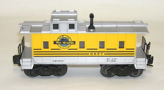 High Grade No. 6657 Rio Grande Caboose 1957,58 +BOXHere is a beautiful Lionel "O" gauge No. 6657 Rio Grande SP-type Caboose - made 1957-58. Nice bright, shinny silver, perfect decals. Condition is like new. Trucks look unrun. I do see a black factory mark on the bottom of one side (see pics). Box is brick, all flaps present. A nice one for your sets. Hard to find in this condition. Price: $249 SORRY! SOLD!