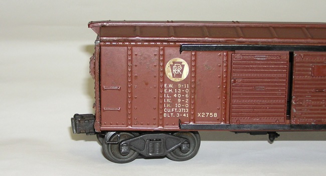 Lionel # x 2458 Postwar Metal Automobile PRR Box CarThis is the No. x2458 metal Pennsylvania RR 61100 Automobile Boxcar. Size is 8-1/8" long not including the couplers. This car is in good condition as seen in the pictures. Some minor wear and dirt on the sides. Also, I see a little swelling on the boxcar ends (see pics). Don't miss this for a nice runner. Thanks. Price: $50 SORRY! SOLD!