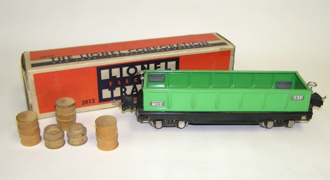 Lionel Prewar No. 2812 Green Gondola Box Couplers + BOXThis evening I am offering for NO RESERVE some of the components of Lionel Freight Set No. 193W - a rare prewar "O" gauge set from 1938/39 (see bottom picture - this is for the below listed item only). This is a very nice prewar Lionel "O" gauge No. 2812 green Gondola train freight car with nickel plates and journals. (4) take-apart barrels and original BOX. I would rate the car on this as like new, and the box very good to excellent - as seen in the photographs. Box is complete but has two pieces of tape on one end. Don't miss this one for your sets. Offering in AUCTION format (support the auction format!) with NO RESERVE. Buyer pays shipping (Insurance is included in the shipping and handling fees for items over $300). Please check out my other items currently listed, and save on shipping. NO RESERVE. Price: $147 SORRY! SOLD!