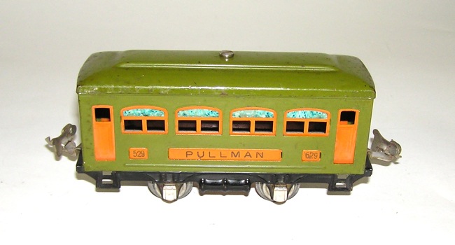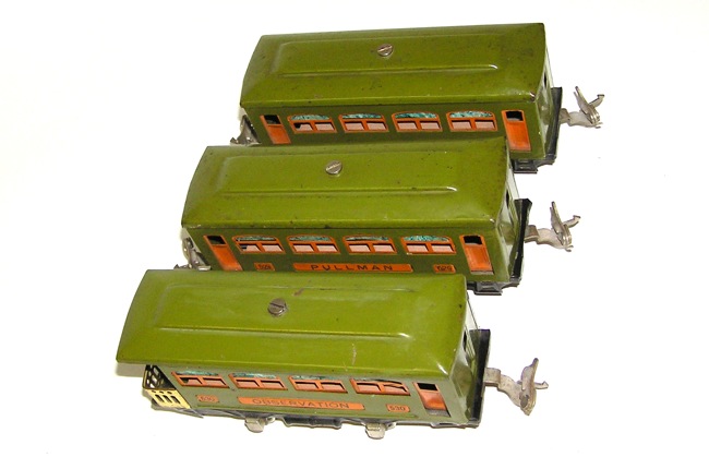 Lionel Prewar O Gauge Set #294 w/ 252 (2) 529 530 Passenger CarsHere is a great looking Set of Lionel prewar "O" gauge trains - Set No. 294 from 1926-30. The Set consists of the 252 Engine pulling (2) No. 529 Pullman's and an No. 530 Observation - all in Olive Green with orange trim - a great color combination. I believe you can tell from the pictures the excellent condition of this set. The exteriors are nice showing only minor wear. They are bright in color, and retain the original Lionel stickers and stamps. The engine also is very nice with only a few minor scratches. Also, I noticed that the wheels show wear with a couple beginning to show some chips. The wheels, however, do turn when pushed. When put on a test track the engine hums but did not run. I believe a good cleaning will make it go. A great looking set - so, don't miss this for your collections. Thanks. Price: $229 SORRY! SOLD!