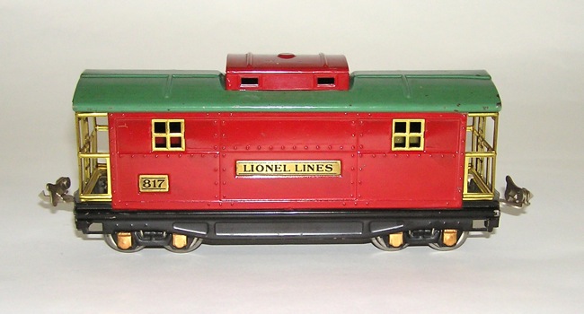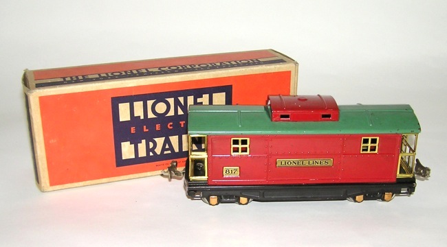 Lionel Prewar No. 817 Red Caboose w/ Peacock Roof + BOXHere is a super Lionel "O" gauge prewar No. 817 peacock on red Caboose with copper journals, brass plates and its original Box. Latch couplers. Size is 8-3/4" not including the couplers. Condition is excellent plus - as seen in the pictures. Just a couple of minor scratches. Box is brick-like with all flaps. Missing a half of a coupler flap on one end. A great freight for your prewar sets. Hard to find many better. Price: $89 SORRY! SOLD!