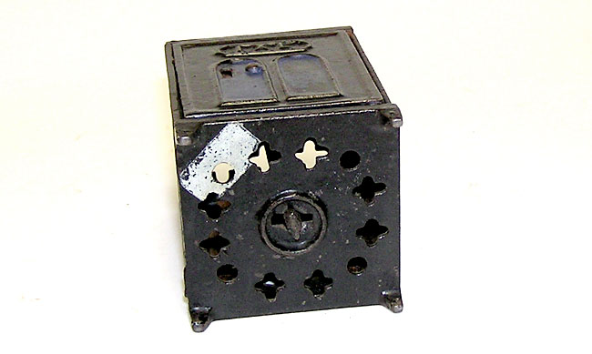 Kyser & Rex Cast Iron I X L Safe BankHere is the small I X L Safe bank. It is listed in Moores as #893. It measures 3" high and 2-1/4" wide and deep. This is the harder to find "blue" version. No key. I would rate the condition of this delicately cast bank as excellent. It has its original paint, and original turnpin. Has not been cleaned. NO breaks or cracks. Listing two IXL banks - see bottom picture. This is for one item only. Price: $129 SORRY! SOLD!