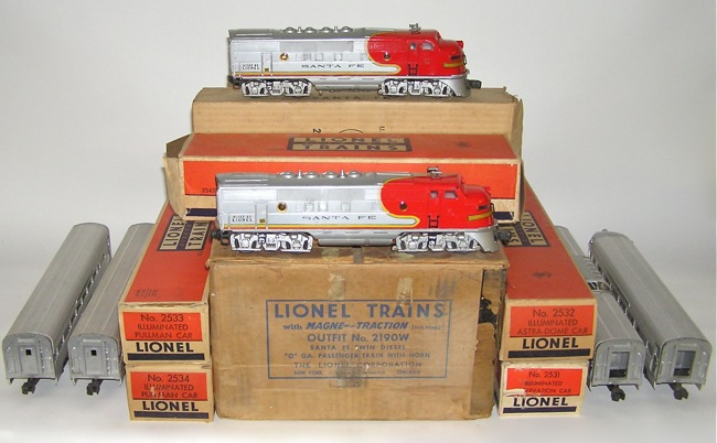 Lionel 1952 2190W Santa Fe AA F3 Passenger Set 2343 2531 2532 ++ (DAKOTApaul)Â Here is a very nice original No. 2190W Santa Fe Super-Streamliner "O" gauge Passenger Set that Lionel made in 1952. This Set includes the No. 2343 Santa Fe F-3 AA Diesels with dual motors, magnetraction and horn. Also, the illuminated aluminum passenger cars - the No. 2531 Silver Dawn Observation, the No. 2532 Silver Range Vista Dome, the No. 2533 Silver Cloud Pullman and the No. 2534 Silver Bluff Pullman. Also includes all the individual boxes with interior linings, and the Set Box. All that is pictured (please click the link to view ALL the photographs before bidding) Â Overall, this set has a lot going for it. I would say the 2343 Santa Fe engines are real nice shape with a couple of places where the paint is nicked. As you can see these are on the black plastic mold shells. Mostly on the top dome fans. Also, the decals have minor wear (as pictured below). No corrosion in the battery area. Inside is nice and clean. The Engine runs in forward and reverse, but will need a good cleaning to run perfectly as these are over 60 yrs. old, the horn has not been tested. The red are still bright on both, silver a little faded. The passenger cars range from very good to excellent. They all have the rivets attaching the name plates. It appears to me that all the bottoms have been painted a flat black. The observation is missing its back door - which can be replaced. The T Box is missing one end flap, all Boxes include their original inserts. The individual boxes are excellent. The 2533 has one end flap that has been replaced, but all the others looks real good with inserts. The set box overall is in very nice condition. Shows some weakness on the taped corner. Has some tape residue, and some wear as pictured. Overall, a great set of trains. Don't miss. I took A LOT of pictures for you to see all, and if anything is not apparent please email. Thanks. Offering in AUCTION format (support the auction format!) with NO RESERVE. Buyer pays shipping (Insurance is included in the shipping and handling fees for items over $300). Please check out my other items currently listed, and save on shipping. NO RESERVE. Â