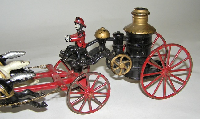 High Grade Kenton Cast Iron Fire Pumper w/Three Horses - Nice!This is a beautiful Kenton Three Horse Medium Sized Fire Pumper, Circa., 1910-23. Measures 15-1/2" long. Driver cast into the seat. This is in outstanding original condition, as seen in the pictures below. With condition being everything when collecting - this is what you want. Original paint, very few scratches, and no breaks, cracks or repairs of any kind. Just a beautiful piece. Buy with confidence. Price: $499 SORRY! SOLD!