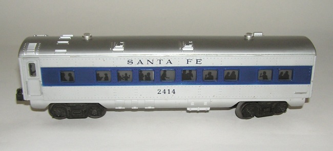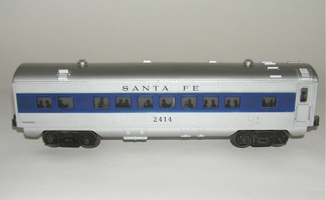 Set (4) Lionel Postwar Santa Fe Passenger Cars 2412, 2414, 2416Here is a super set of Lionel late postwar Passenger Cars. This set of (4) Lionel "O" gauge blue-stripe Santa Fe passenger cars includes - No. 2412 Vista-Dome, another No. 2412 Vista-Dome, the No. 2414 Pullman and the No. 2416 observation. The cars themselves are in excellent to like new condition. Little if any run time. All lights work. Just a few minor marks keeps them from grading higher. Don't miss these for your collections. Price: $432 SORRY! SOLD!