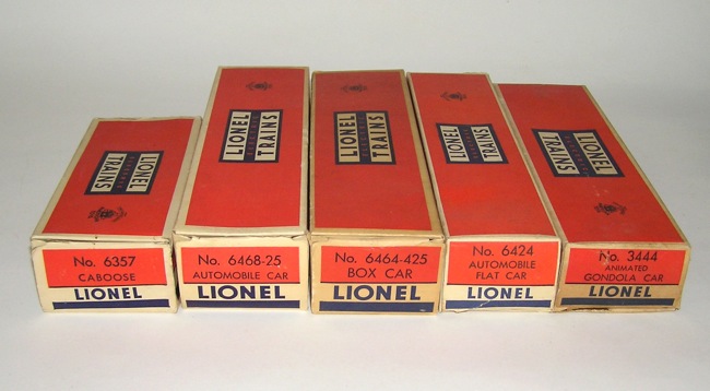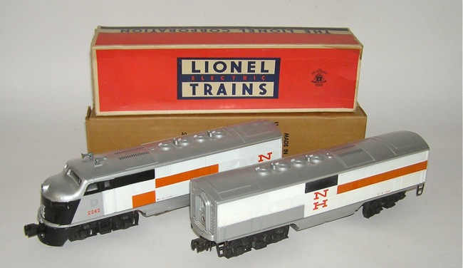 Here is the No. 2507W Freight Set that Lionel made in 1958; a wonderful and hard to find F-3 set. This Set includes the No. 2242P/C New Haven F-3 AB Diesels with magnetraction and horn, the No. 6424 Flat Car with two automobiles, the No. 6464-425 New Haven Box Car, the No. 3444 Operating Animated Erie Gondola, the No. 6468-25 New Haven Double Doors Automobile Box Car, and the No. 6357 Illuminated SP-Type Caboose. Comes with all the Individual Boxes, some paperwork, catalog, and the rare Set Box. All that is pictured in the many photos below. (and please click the link above to view over 60 pictures of the set)