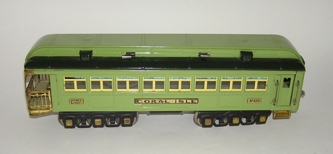 Lionel # 424 425 & 426 Stephen Girard Passenger Cars NO RESERVE (DAKOTApaul)Here is a great set of Lionel Standard Gauge Passenger Cars that were made in the 1930s. These are the No. 424 Liberty Bell Pullman, the No. 425 Stephen Girard Pullman, and the No. 426 Coral Isle Observation Car. These are in nicely restored condition. I believe that if you look at all the pictures, you can see the condition well. Looks like an older restoration, and done very nicely. All the brass plates and hardware appears original. A great looking set. Hard to come by, so don't miss. Offering in AUCTION format (support the auction format!) with NO RESERVE. Buyer pays shipping (Insurance is included in the shipping and handling fees for items over $300). Please check out my other items currently listed, and save on shipping. NO RESERVE. Price: $660 SORRY! SOLD!