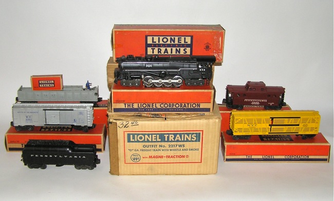 Lionel #2217WS 682 Turbine 1954 Freight Set 6464-175 2046W +BOXES (DAKOTApaul)This is the No. 2217WS Freight Set that Lionel made in 1954. This Set includes the No. 682 Diecast Steam Turbine with Headlight, Smoke and Magnetraction, the No. 2046W Pennsylvania Whistle Tender, the No. 6464-175 Silver Rock Island Box Car, the No. 6356 NYC Cattle Car, the No. 3562-25 Gray Blue Lettering Operating Barrel Car and the No. 6417 Pennsylvania N5C Caboose. Includes all individual BOXES, and the rare SET BOX. All that is pictured in the many pictures below Some notes to help with your assessment of the condition. The 682 Engine is really nice. One of the better ones I've seen in a while. All original with original white stripe down the side rails. The engine runs well in forward and reverse.The engine box is missing its flaps on one end, and has some tape residue. Includes its original insert. The tender looks very nice with some minor wear. Silver PENNSYLVANIA on the sides. No other breaks or cracks. Whistles well. Its box is brick like, in get shape, original insert. The "Route of the Rockets" 6464-175 car is in very good shape. A few minor rubs and some aging to the silver. Has the correct crossed-out 6464-50 stamped "silver" box. A very nice NYC Stock car and box. The 3562 Barrel car has some flaking of paint on top. Box with barrels included. The Caboose is like new along with its box. The Set Box is a nice one. Nice and square, firm, and complete. Buy with confidence. A nice set. Thanks. Price: $1134 SORRY! SOLD!