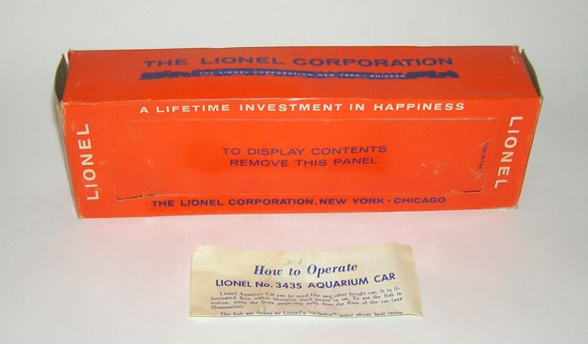 UNRUN Lionel Postwar No. 3435 Traveling Aquarium Car + BOXHere is an extremely nice postwar Lionel Freight Car - the No. 3435 Yellow Stamped Traveling Aquarium Car. Measures 9-1/2" long not including the couplers. Condition is MINT like new - as seen in the pictures. Wheels show NO run time. Box is complete with all flaps, includes its original instruction sheet. A nice example. Don't miss this to upgrade your sets. Price: $404 SORRY! SOLD!