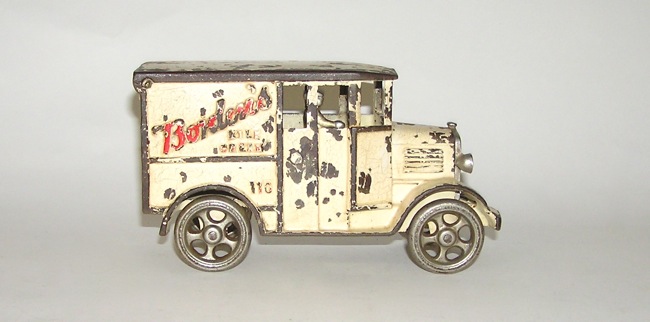 Rare Large Sized Hubley Cast Iron Borden's Milk & Cream TruckHere is toy you don't see very often - the large size Hubley cast iron Borden's Milk and Cream Truck, with nickeled grille and driver. Measures 8" long. This one is in very good condition - as seen in the pictures below. Original paint. Replaced rear tail gate, otherwise, no breaks, cracks or repairs. Great nickel plated cast iron wheels. A nice toy. Don't miss! Price: $1995 SORRY! SOLD!