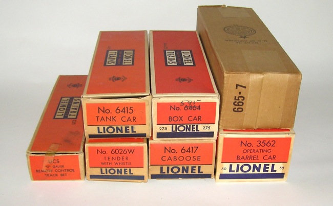 Lionel Postwar O gauge Set # 2237WS w/ 665 6026WHere is a set you won't find very often - the Lionel postwar "O" gauge Set No. 2237WS from 1955. The set fetures the 4-6-4 No. 665 Steam Locomotive with its No. 6026W whistle tender. The Engine pulls a No. 6464-275 SOM Boxcar, type IIA, grooved; a No. 3656-50 yellow barrel car, complete; the No. 6415 Sunoco tank car; and a No. 6417 PRR N5c caboose. The set overall is in like new condition. The Engine looks great - little runtime with a like new patina. The freights are in similar condition with a truly outstanding yellow barrel car. Caboose is missing one coupler and the set box has some stains. All individual boxes look great. The Engine box is marked '56' and the Instruction booklet is 55/56. Take a look at all the pictures, you won't be disappointed in this one. Thanks. Price: $786 SORRY! SOLD!