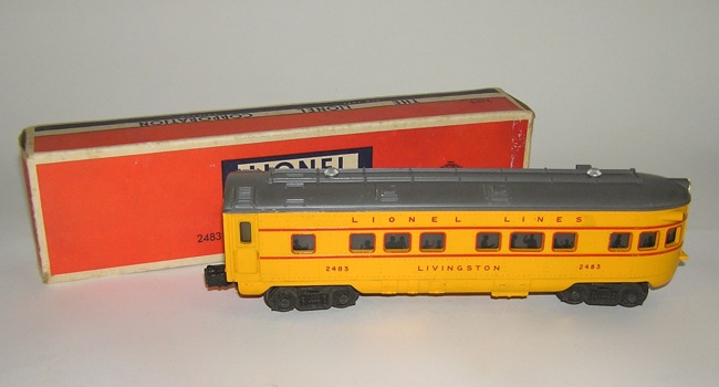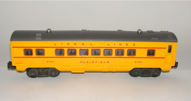 High Grade Set (3) Lionel Anniversary Passenger Cars 2481, 82, 83 LN/OBHere is a great set of Lionel postwar trains - the Lionel Lines passenger car set made for the Union Pacific Anniversary Sets in 1950. What we are offering is the No. 2481 "Plainfield" lighted passenger car with silhouettes, the No. 2482 "Westfield" lighted passenger car with silhouettes, and the No. 2483 "Livingston" lighted observation car with silhouettes. All come in their original BOXES. These passenger cars overall are beautiful. In like new condition - as seen in the pictures below. Strong graphics, nice red highlights. Roofs are all very nice. Trucks look clean, hardly any runtime. The 2481 box is missing its coupler flaps, and has tape on one end. The 2482 box is missing its coupler flaps, but overall is a real nice box. The 2483 has one end where the coupler flap was torn off. I believe the pictures tell the story well. Please ask any further questions.Thanks. Price: $1250 SORRY! SOLD!