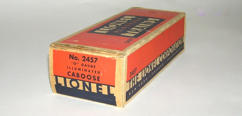High Grader Lionel # 2457 PRR Illuminated Caboose Flying Shoe +BOXHere is a high grade car - the No. 2457 Pennsylvania Illuminated Caboose with the early black fiber board Flying Shoe Couplers plus its original BOX with Insert. Couplers on both ends. Size is 6-1/2" long not including the couplers. This car is beautiful in like new condition as seen in the pictures below. Trucks are complete in an unbroken state. Thick axles. Black flying shoe (making this a 1945 car). Interesting box with coupler flaps. All flaps have been reinforced with tape. Missing one interior flap. A great looking piece - don't miss. Also, offering a tank car and gondola from the same early postwar period in separate listings (see bottom picture for the group - this is for the caboose ONLY). Thanks. Price: $99 SORRY! SOLD!