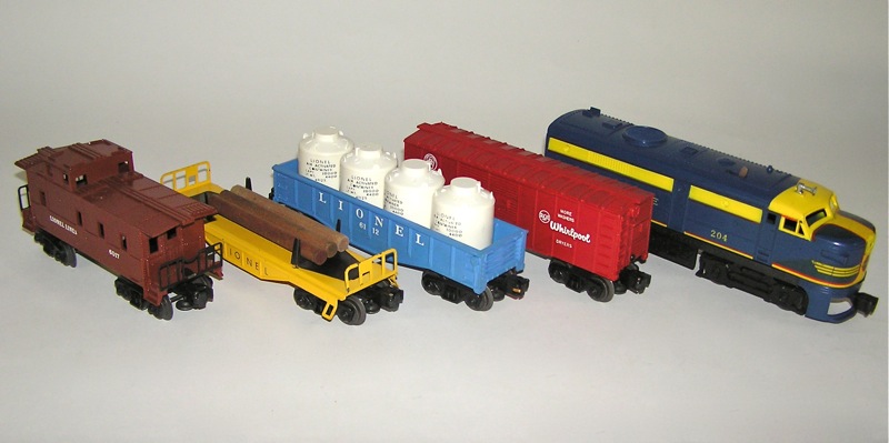 Nice! Lionel X589 freight set w/ 204, 6024 Whirlpool Set BoxHere is a very nice original Lionel X-589 freight set including 204 Santa Fe Alco, 6024 Whirlpool boxcar, 6012 Gondala with white cannisters, a 6111 yellow pipe flatcar, and the No. 6017 caboose, Comes with 8 pieces of curved track and (3) straights. Some paperwork and controller. All that is pictured below. The set looks like new. If it was run, it was just for a test. Engine is complete with just a few small cracks in the decal. One of the better ones I seen recently. Engine will need to be lubed before operation. Wheels stuck from inactivity. Set box is nice and bright. A wonderful set - don't miss. Price: $410 SORRY! SOLD!